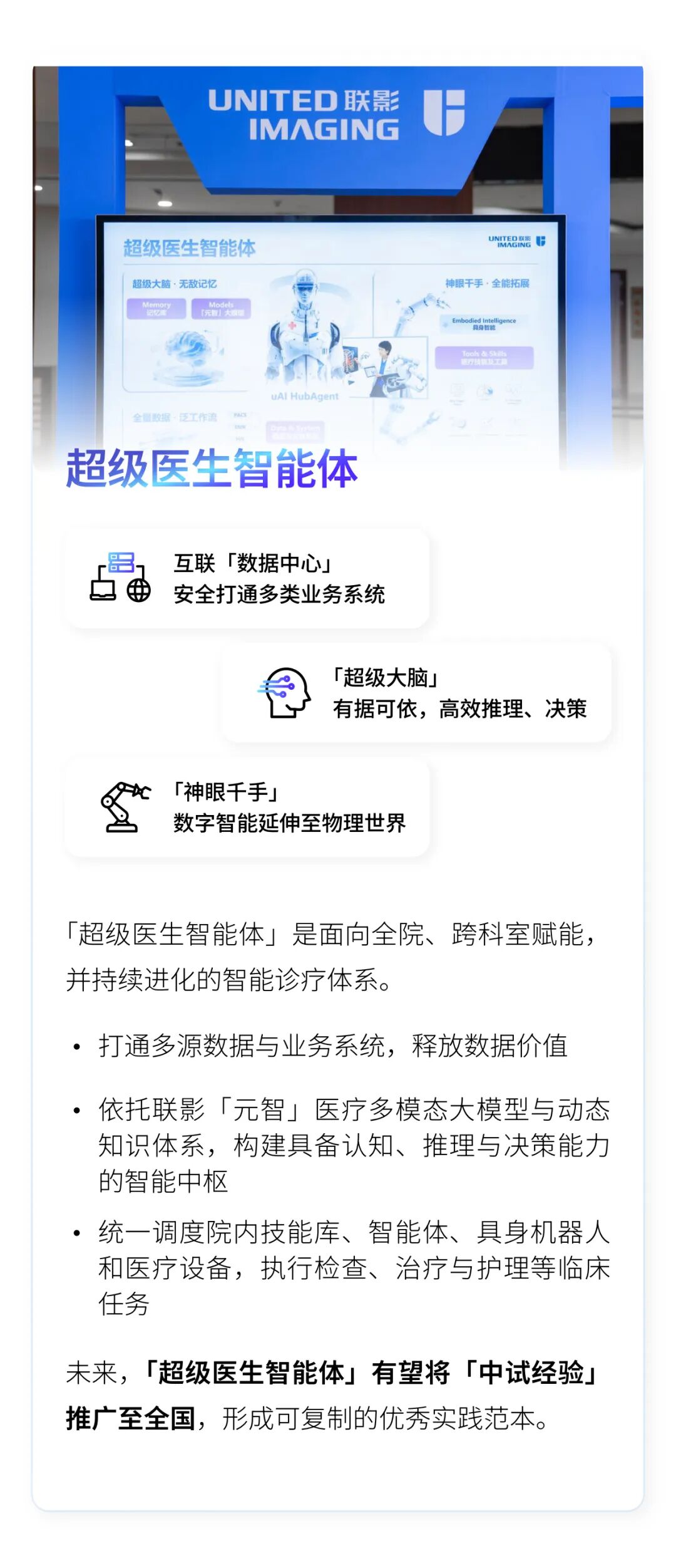3 月 28 日,「中试为壤 智创未来」国家人工智能应用中试基地(医疗领域)阶段性成果总结发布会在复旦大学附属中山医院举行。本次发布会披露国家人工智能应用中试基地(医疗领域)建设阶段性成效,发布 5 大核心创新成果与 9 款医疗智能应用,有力推进我国人工智能+医疗高质量发展,让医疗智能技术更好惠及民生。上海市副市长陈宇剑出席会议。 目前,国家人工智能应用中试基地(医疗领域)已初步建成集算力基础、语料知识库、医疗大模型与智能体、临床多场景验证与评测为一体的中试验证平台,为「人工智能+临床医学科研」技术的规模化应用奠定坚实基础。 「中试为壤 智创未来」国家人工智能应用中试基地(医疗领域)阶段性成果总结发布会现场照片 发布仪式上,国家人工智能应用中试基地(医疗领域)集中发布五大阶段性核心成果:一是构建覆盖计算、存储、网络与开发工具链的一体化新型算力服务平台;二是推出 6 大医疗垂直基础模型;三是建成全国示范性医疗 AI 数据基础设施;四是打造全球领先的中文医疗大模型测试平台;五是遴选推广多学科、多场景世界级医疗智能应用,推动前沿技术从实验室快速落地临床一线。 作为 AI 医疗领域的重要创新力量与示范企业,联影智能自主研发的「元智」医疗影像大模型入选发布成果,彰显其在医疗影像 AI 技术创新与落地应用方面的领先实力。 会议同期,场外成果展览同步举行,20 余家科技企业集中亮相,吸引大量与会嘉宾驻足交流。 联影智能展台重点展出「超级医生智能体」、uAI MedTuring 医图灵析及 uAI MedScribe 医智速录等代表性应用,直观展现 AI 医疗在真实临床场景中的应用价值。 · 复旦大学附属中山医院党委书记、国家人工智能应用中试基地(医疗领域)项目负责人顾建英教授在现场介绍 U 爱助手 会议现场,国家人工智能应用中试基地(医疗领域)与上海市徐汇区、浦东新区、闵行区、嘉定区 4 个区,复旦大学、上海交通大学、上海人工智能实验室等 8 家科研院所,瑞金、仁济、华山等 28 家医院,以及包括联影智能在内的 20 家领军企业完成生态合作伙伴签约,全面凝聚政产学研用协同创新合力,推动 AI 医疗技术规模化落地。 联影智能签约照片 在成果分享环节,来自科研机构、中西医院、合作园区及科技企业的多方代表,围绕 AI 医疗在科研探索、临床诊疗、医院管理等场景中的实践应用展开分享。其中,联影智能联席 CEO 周翔发表题为《从「超级医生」到「未来医院」》的演讲,阐述 AI 驱动下未来医疗体系的演进方向。 国家人工智能应用中试基地(医疗领域)是落实国家战略、打造全球医学 AI 应用高地的关键载体,推动 AI 医疗从单点突破迈向系统集成。 在这一进程中,联影智能将持续深耕医疗大模型与智能体技术,依托基地平台,与政产学研医各方协同创新,共同推动智能医学高质量发展,为健康中国战略注入强劲科技动能。