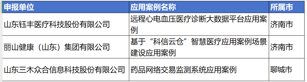 2023 年度山东省优秀大数据产品中,医疗健康相关产品如下:2023 年度山东省优秀大数据解决方案名单中,医疗健康相关解决方案如下:此外,在2023 年度山东省优秀大数据应用案例名单中,也包括几项医疗健康大数据应用案例:本次公布的名单中,还包括北方健康医疗大数据科技有限公司等75家重点数厂,山大地纬软件股份有限公司等19家重点数商。