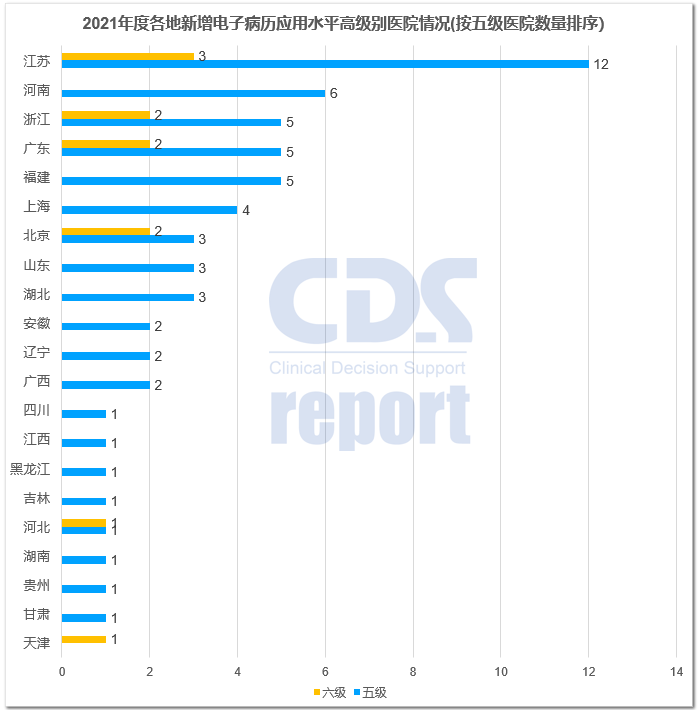 根据2021年度参加评价通过五级及以上医疗机构(新增)名单统计,电子病历高级别医院新增数量TOP5的省份/城市为:江苏(3家六级、12家五级),浙江(2家六级、5家五级),广东(2家六级、5家五级,与浙江并排),河南(6家五级),北京(2家六级,3家五级)。意味着这些地区在2021年度中有更多的医院电子病历智能化程度提升,在以电子病历为核心的信息化建设中有更积极的探索。