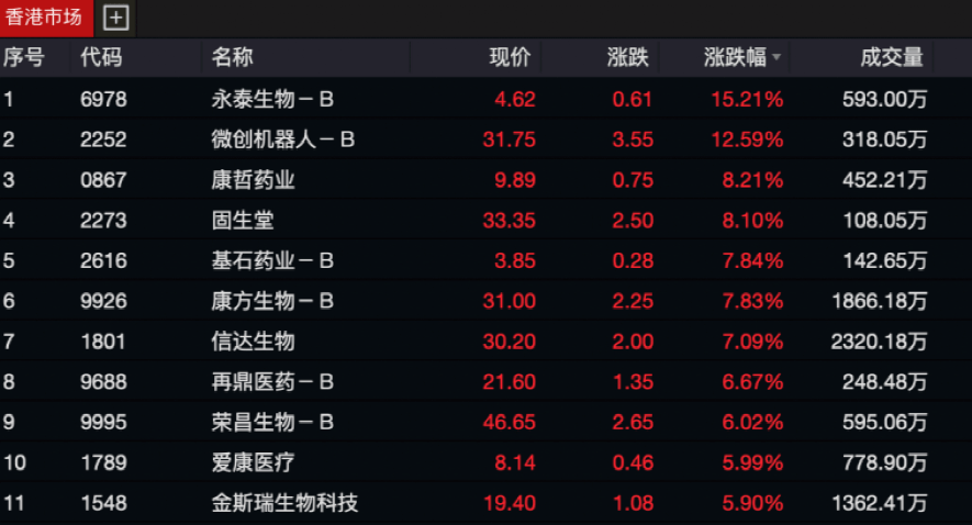 实际上,近日以来,医疗行业暖风频吹,相关股票表现也比较活跃。截至发稿,港股的永泰生物上涨超15%,康哲药业、固生堂上涨超8%,基石药业、康方生物、信达生物上涨超7%。